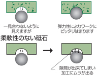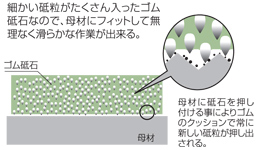 加工表面の極微細部・凸部を残したまま凹部にまで砥粒が クッションして届き素早く磨け表面が滑らかになる。 また、凸部が残っているため精度変化が極めて少ない。 砥石の砥粒により調整できます